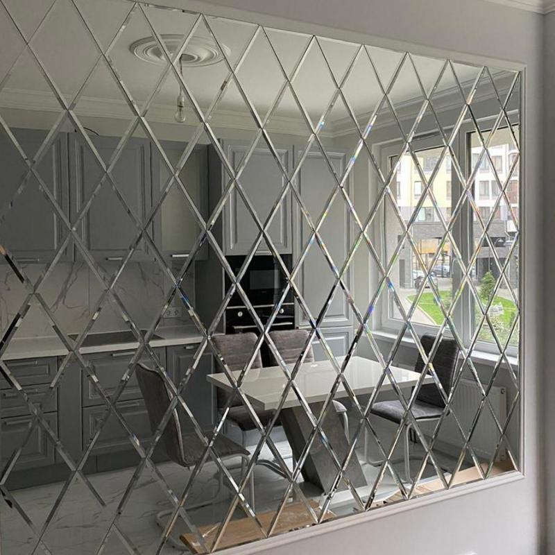 Использовалась серебристая зеркальная плитка формы "вытянутый ромб".